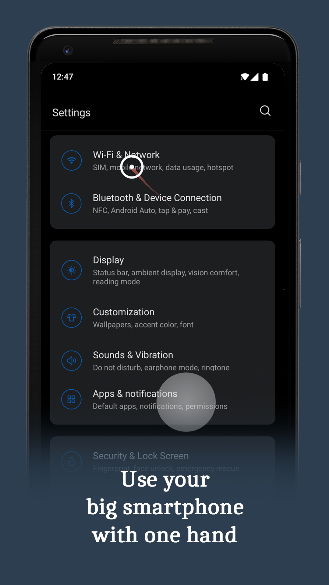 Princip aplikace je geniálně jednoduchý. Namísto toho, abyste se snažili palcem dosáhnout na horní část obrazovky, aktivujete gestem (potažením ze spodní části nebo stran displeje) virtuální kurzor. Ten se skládá ze dvou částí: