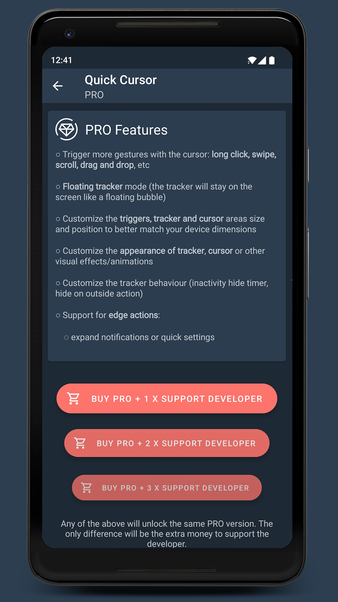 Aplikace využívá služby přístupnosti systému Android, aby mohla simulovat dotyky a gesta na obrazovce. Základní verze aplikace je k dispozici zdarma a pro většinu běžných uživatelů je naprosto dostačující. Pokud byste však chtěli odemknout pokročilé funkce, jako je detailní úprava vzhledu nebo specifické akce kurzoru, můžete si pořídit předplatné nebo doživotní licenci.