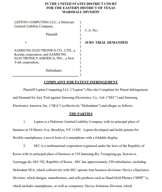 V žalobě se uvádí, že Samsung Electronics s Lepton Computing LLC jednal o výrobě skládacích zařízení už v roce 2013, ale spolupráce nakonec nevznikla. Firma nicméně prý jihokorejskému gigantovi poskytla své prototypy a sdělila technické detaily a Samsung tyto údaje prý následně zneužil a bez svolení je využil k tvorbě svých skládacích mobilů Flip a Fold.